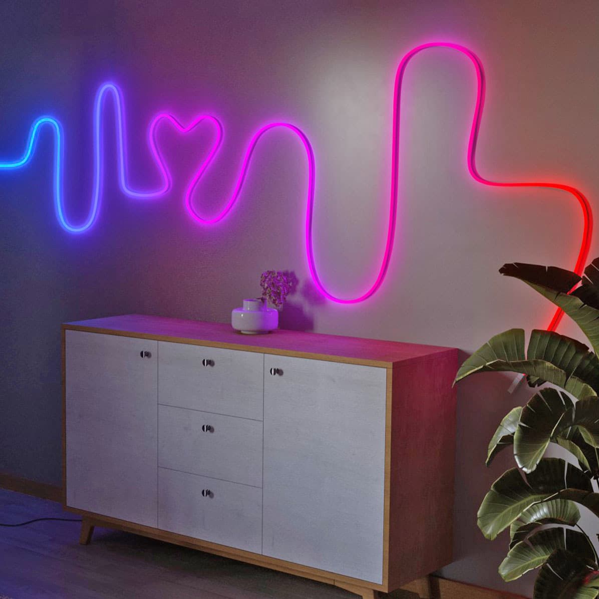 Die Montage und Inbetriebnahme des LED-Bands ist unkompliziert und schnell erledigt: Über die dazugehörige App wird das Leuchtmittel im Handumdrehen ins WLAN-Netzwerk eingebunden, ganz ohne zusätzliche Hardware wie etwa einen externen Hub. Sobald die Einrichtung abgeschlossen ist, kann es sogar via Amazon Alexa, Google Assistant oder Siri per Sprachbefehl gesteuert werden. Für das Anbringen an der Wand, an Möbelstücken, an Bäumen und sonstigen Objekten sind mehrere Befestigungsclips im Lieferumfang enthalten. Durch die hohe Biegsamkeit des Leuchtbands sind der Kreativität kaum Grenzen gesetzt und es kann in verschiedenen Mustern und Formen angebracht werden.