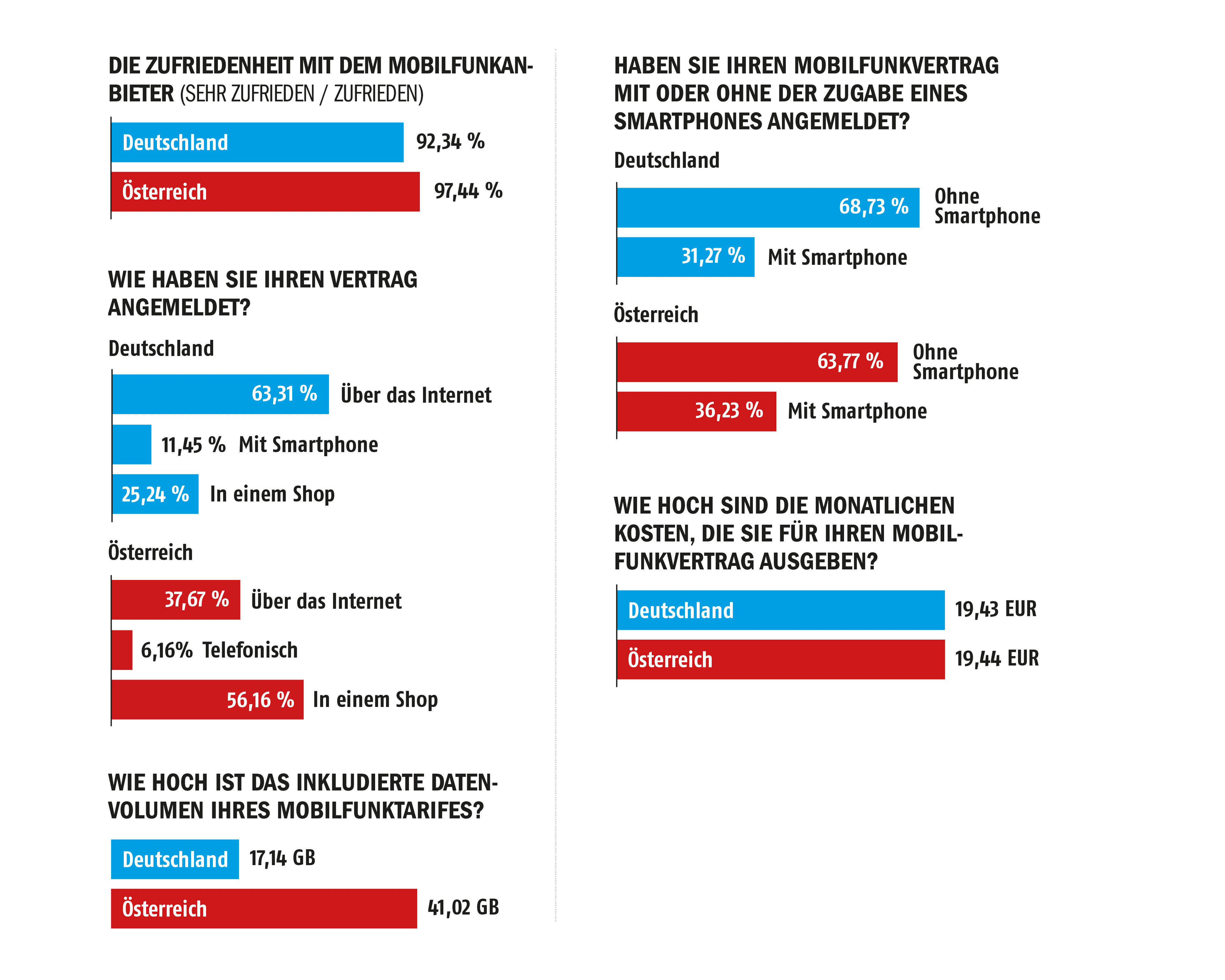 Die durchschnittlichen Datenvolumen unterscheiden sich hingegen in beiden Ländern eklatant. Während die Deutschen mit knapp 17,14 GB auskommen müssen, bekommen die Österreicher mit 41,02 GB mehr als das doppelte Datenkontingent. Die Zufriedenheit mit der Netzabdeckung ist mit einer Zustimmungsrate von über 82 Prozent in Deutschland und 87,23 Prozent in Österreich hoch. Dies bedeutet im Umkehrschluss, dass die meisten Nutzer in der Lage sind, überall dort, wo sie es benötigen, auf ihr Mobilfunknetz zuzugreifen.