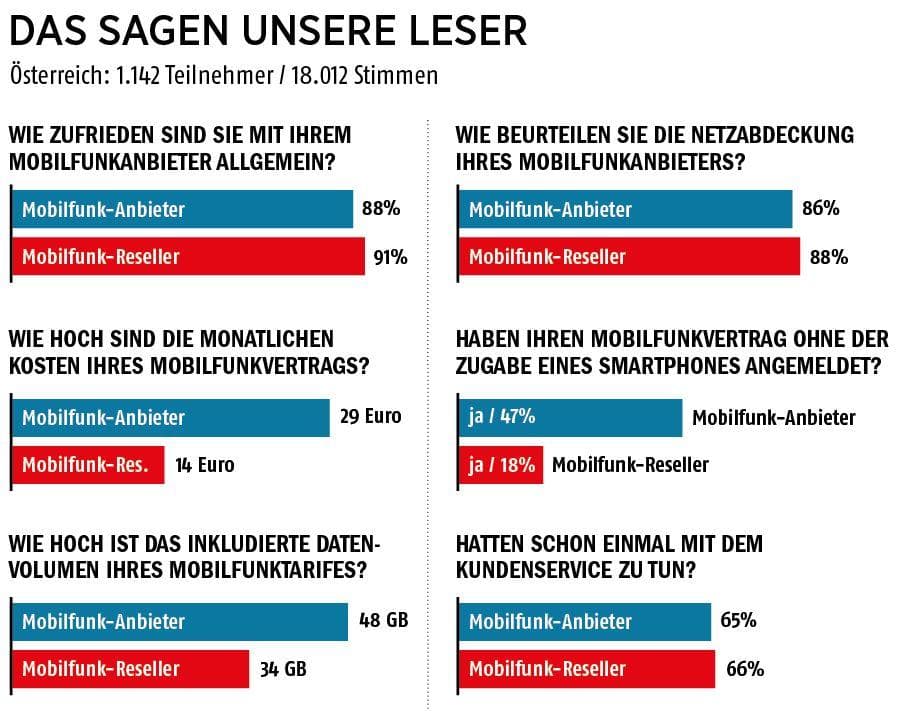 Die Fragestellung war breit gefächert: Von der generellen Zufriedenheit über Netzabdeckung, Service und Weiterempfehlung bis hin zu Faktoren wie monatlichen Kosten und inkludiertem Datenvolumen – insgesamt elf Kategorien flossen in unsere Auswertung ein.