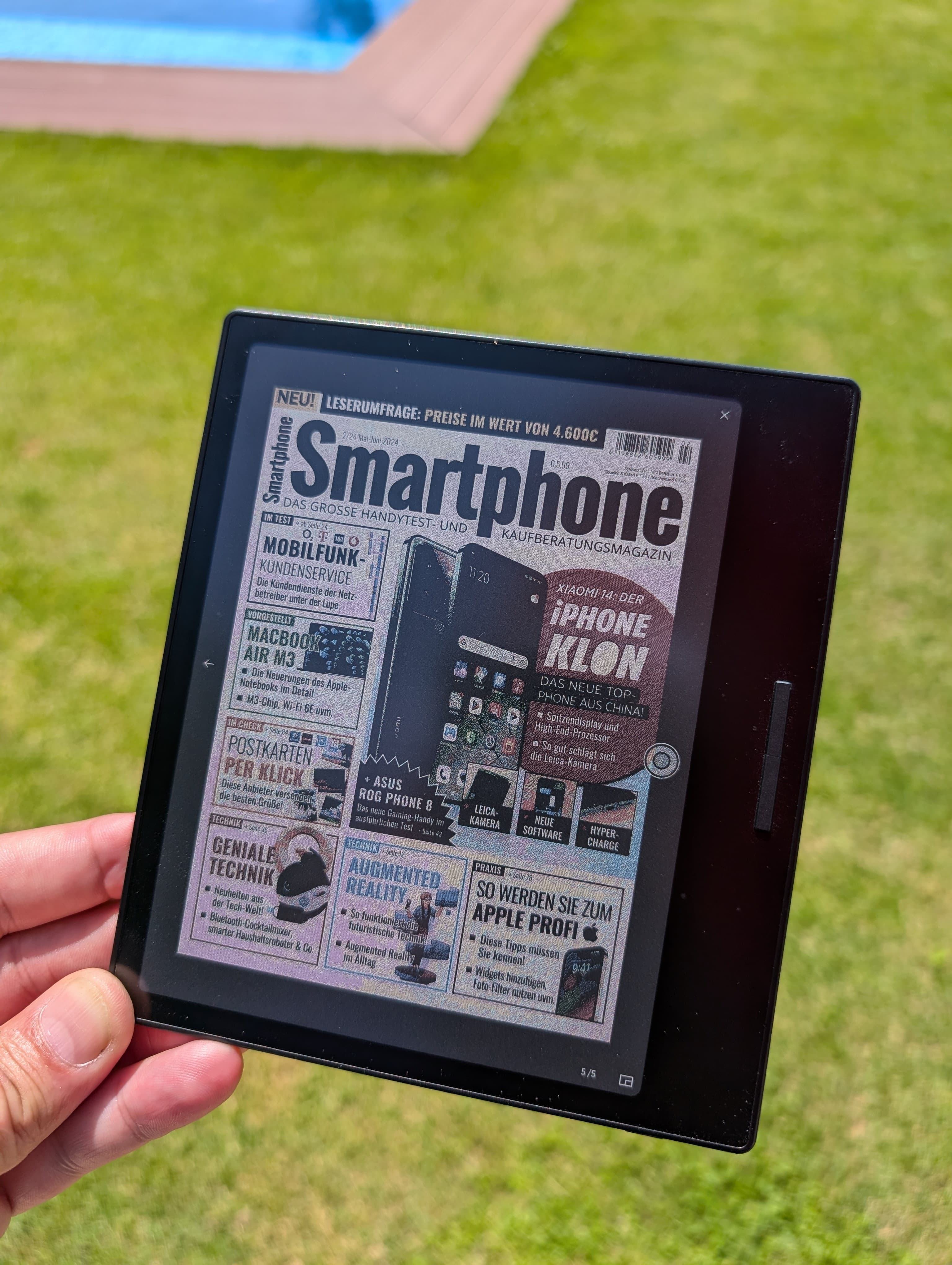Das 7-Zoll-E-Ink-Display bietet eine ausgezeichnete Lesbarkeit mit 300 ppi für Schwarz-Weiß- und 150 ppi für Farb-Inhalte. Die Darstellung von Comics und farbigen Inhalten in 4096 Farben ist zwar nicht mit einem LCD oder OLED vergleichbar, hat aber ihren eigenen Reiz. Der Bildschirm ist entspiegelt und selbst bei vollem und direktem Sonnenlicht gut ablesbar. Die Einstellungen für Helligkeit und Farbtemperatur können manuell angepasst werden, allerdings fehlt eine automatische Anpassung an das Umgebungslicht.