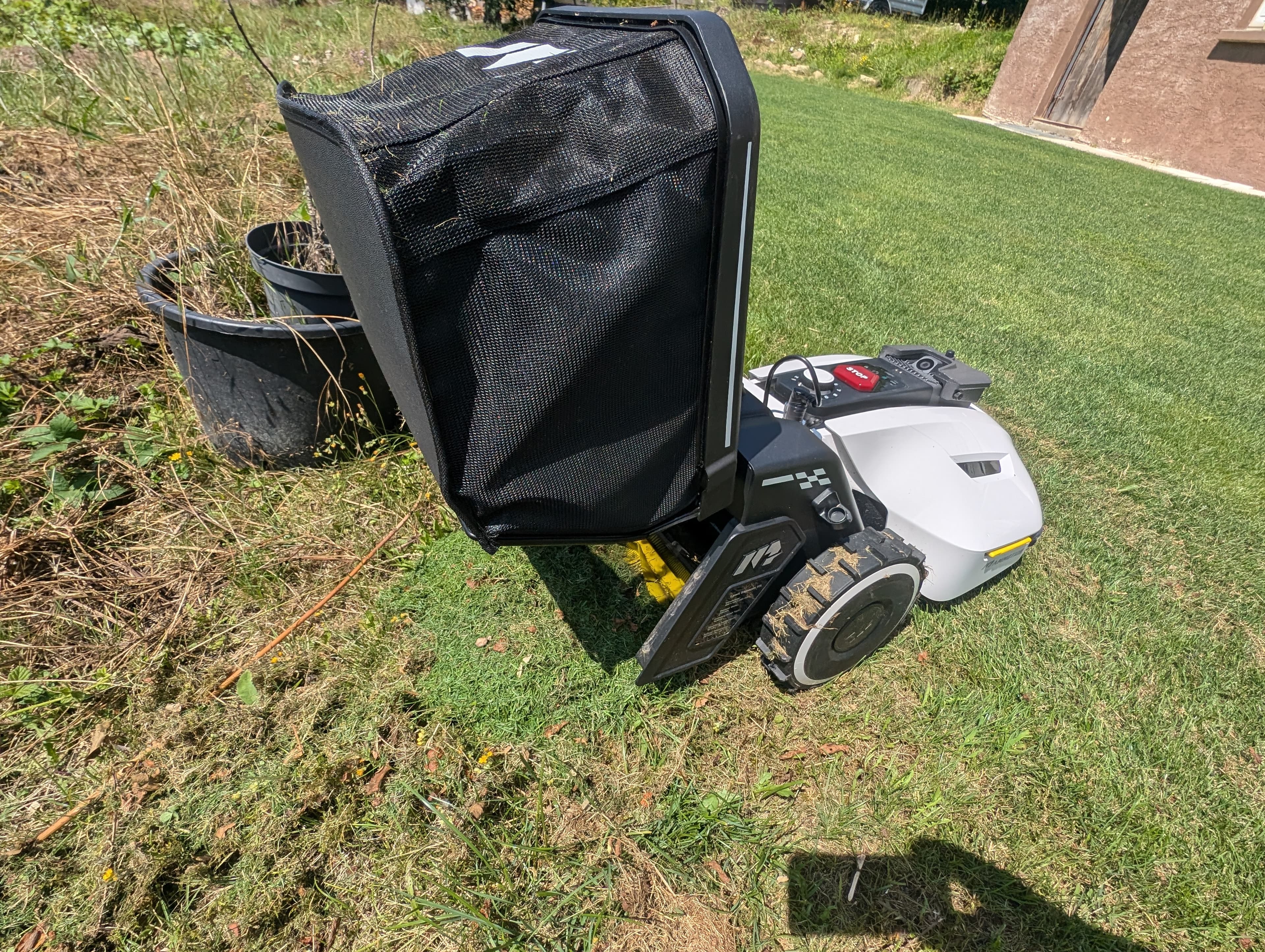 Die Mähbreite der zwei Messerplatten ist mit 32 cm etwas schmaler als bei den Luba-Modellen und die Schnitthöhe lässt sich auch nicht mehr per App regulieren, sondern klassisch per Drehknopf. Ohne Sammler kann der Yuka Steigungen von bis zu 45 Prozent bewältigen; mit dem großen Sammelbehälter, dem Sweeper-Kit, sind es allerdings nur 18 Prozent. Solche Abstriche nimmt man jedoch gerne in Kauf, sobald man die neue Sammelfunktion kennenlernt, denn die stellt alles in den Schatten.