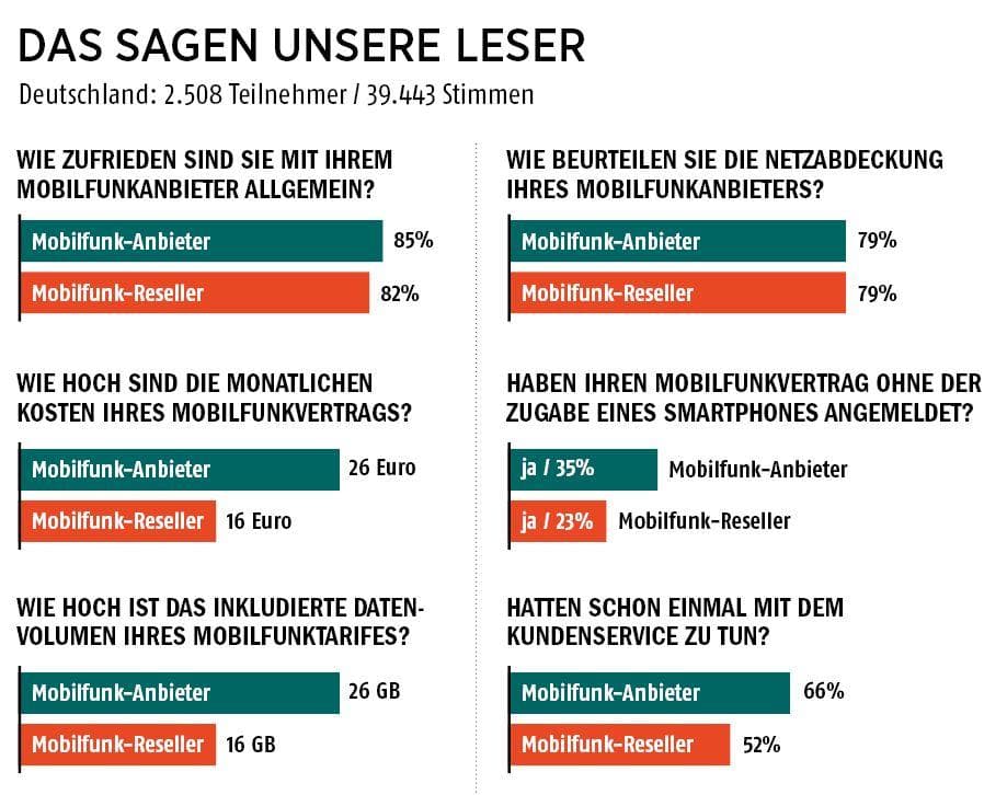 Mit elf Fragen wurden unsere Leser zu Themen wie allgemeiner Zufriedenheit, Netzabdeckung, Angebotspalette, Weiterempfehlung, Servicekontakt, aber auch zu objektiven Werten wie Datenvolumen oder Vertragsmodell befragt.