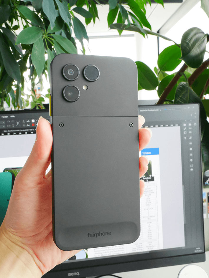Rein optisch präsentiert sich das Fairphone 6 überarbeitet: Der wohl markanteste Unterschied betrifft den abnehmbaren Akkudeckel, der erstmals verschraubt ist. Und auch die Kameralinsen sind nicht mehr in einem eigenen Balken angeordnet. Direkt über dem Einschaltknopf befindet sich ein gelber Schieberegler.