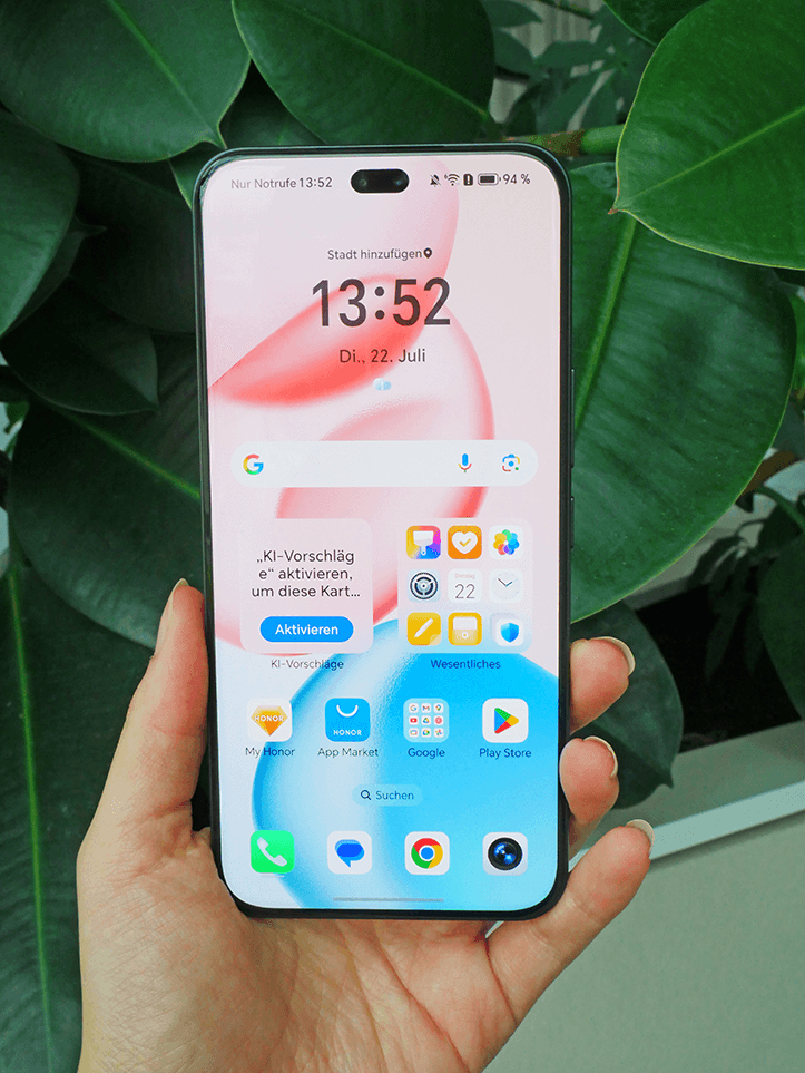 Neben der 200 Megapixel starken Hauptkamera umfasst die Triple-Kamera ein 50 Megapixel Teleobjektiv und eine 12 Megapixel Ultraweitwinkellinse. In unserem Test punkten die Aufnahmen mit einem starken Kontrast und einer hohen Detailtreue. Die Farbdarstellung ist überaus realistisch. Nachtaufnahmen gelingen ebenfalls – trotz gelegentlichem Bildrauschen bleibt die Bildqualität insgesamt überzeugend. Die Ultraweitwinkelkamera kann in puncto Schärfe, Bilddetails und Farbdynamik nicht ganz mit den beiden anderen Modulen mithalten, liefert aber dennoch brauchbare Ergebnisse. Fotos mit einer bis zu 50-fachen Vergrößerung sind mit dem 400 Pro möglich. Bei diesen Aufnahmen hilft die Software allerdings sehr stark mit, um ein halbwegs vernünftiges Ergebnis zu erzielen. Nutzer können zwischen drei Bildprofilen wählen: Natürlich, Dynamisch und Authentisch. Diese beeinflussen Farbsättigung, Kontraste sowie die Wiedergabe von hellen und dunklen Bildbereichen. Die Software selbst hat Honor mit Künstlicher Intelligenz zur Bildbearbeitung aufgepeppt. So entfernt etwa ein KI-Radierer störende Objekte oder Personen wie durch Zauberhand von den Aufnahmen. Schnappschüsse können bei Bedarf auch mithilfe der KI erweitert werden. Störende Reflexionen werden durch die Software ebenso entfernt.